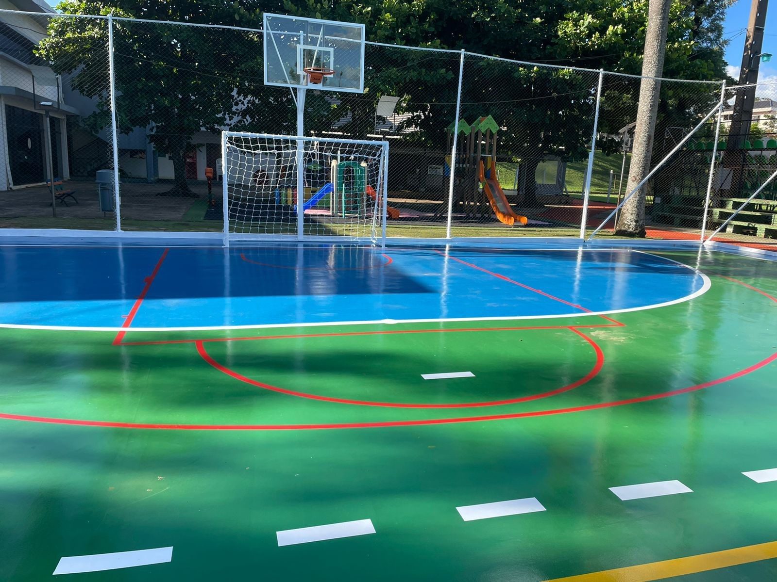 Las especificaciones técnicas de la reacondicionada pista de futsal son las siguientes: Desbaste y pulido de hormigón, tratamiento de juntas de dilatación, aplicación de tela de poliéster para juntas, aplicación de top coult P.U flexible, aplicación de pintura PU, terminación brillante.