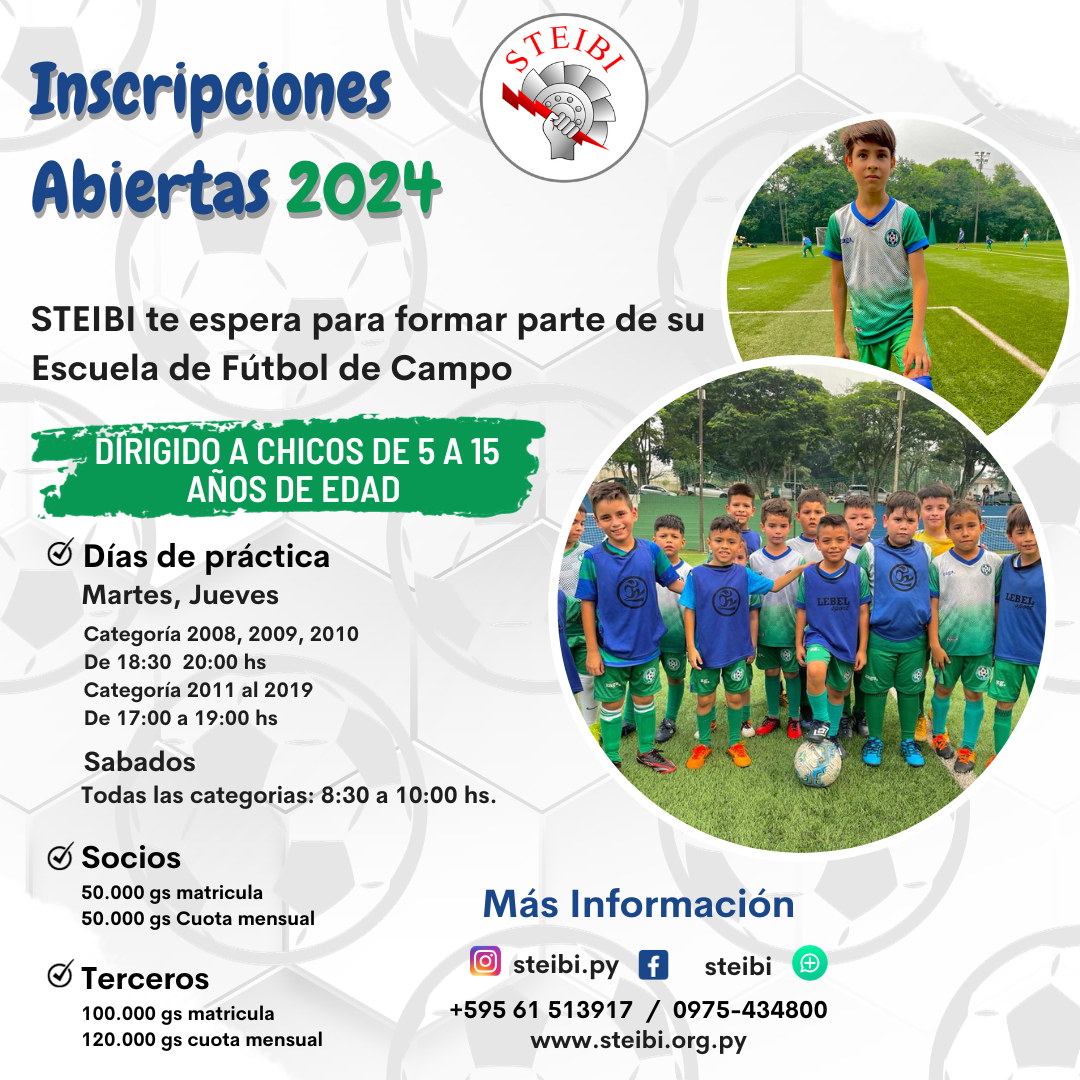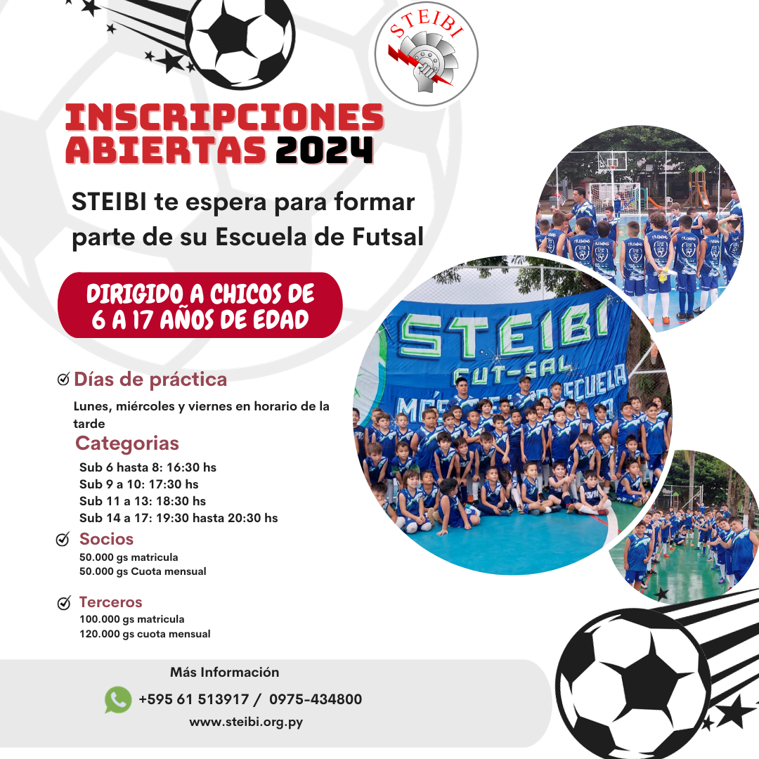 La Temporada 2024 de la Escuela de Futsal del STEIBI se inicia este 10 de Enero. ¡Vení, que estas esperando, cupos limitados!, las inscripciones están abiertas para hijos de socios y no socios de 6 a 17 años de edad.
