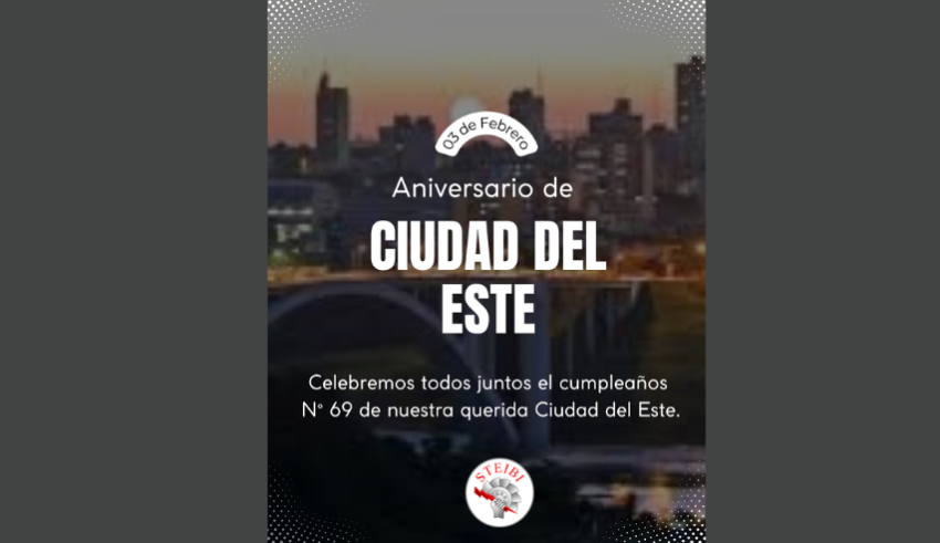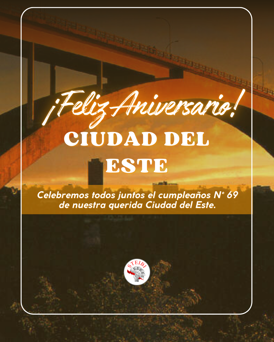 El Sindicato de Trabajadores de la Empresa ITAIPU Binacional (STEIBI) celebra este nuevo aniversario con la fuerza de su gente, el coraje de quienes la construyeron y la esperanza de quienes la siguen haciendo crecer cada día. Una pujante y progresista Ciudad que late con diversidad, esfuerzo y orgullo. Ciudad del Este es desafío y oportunidad, es identidad forjada en la solidaridad de sus habitantes. 🎁🎊